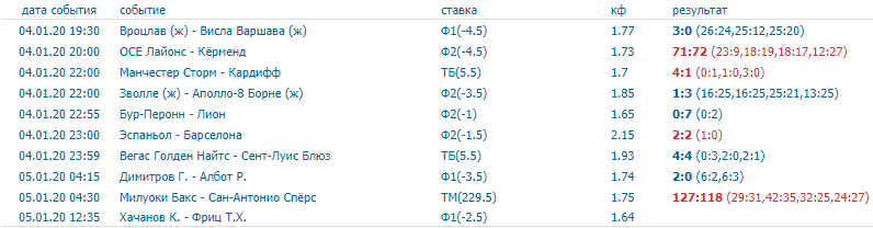 Скриншот всех прогнозов на спорт на 4 января (включая прогнозы на баскетбол)