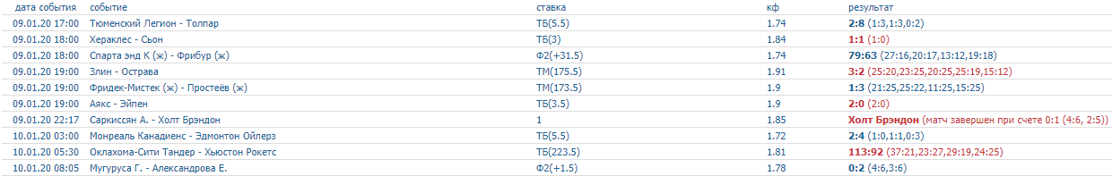 Скриншот всех прогнозов на спорт на 9 января (включая прогнозы на баскетбол)