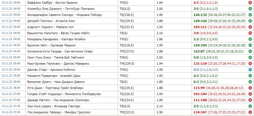 19.11.23, 04:00 Бостон Брюинз - Монреаль Канадиенс ТБ(6) 2.00 - 15019.11.23, 04:00 Нью-Джерси Девилз - Нью-Йорк Рейнджерс ТМ(6) 1.9219.11.23, 04:00 Калгари Флэймз - Нью-Йорк Айлендерс ТБ(6) 2.0619.11.23, 04:00 Каролина Харрикейнз - Питтсбург Пингвинз ТБ(6) 1.86 - 15019.11.23, 04:00 Виннипег Джетс - Аризона Койотис Б(6.5) 2.1019.11.23, 05:00 Сан-Антонио Спёрс - Мемфис Гриззлис ТМ(225.5) 1.90 - 510