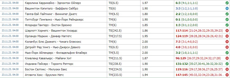 23.11.23, 04:00 Детройт Ред Уингз - Нью-Джерси Девилз ТБ(6.5) 2.03 - 34023.11.23, 04:30 Нью-Йорк Айлендерс - Филадельфия Флайерз ТМ(5.5) 2.0023.11.23, 04:30 Кливленд Кавальерс - Майами Хит ТМ(211.5) 1.8723.11.23, 04:30 Индиана Пэйсерс - Торонто Рэпторс ТБ(238.5) 1.9023.11.23, 04:30 Бостон Селтикс - Милуоки Бакс ТМ(234.5) 1.90