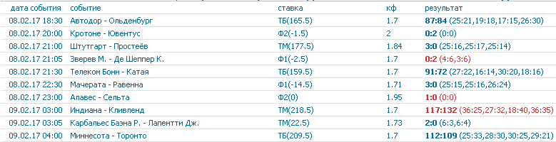 Скриншоты моих прогнозов на спорт 8-го февраля