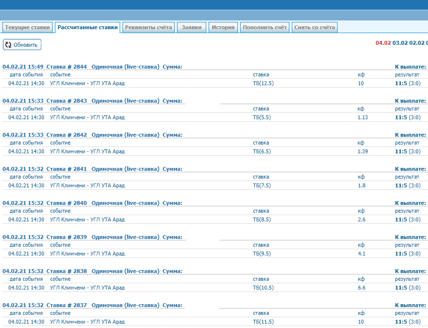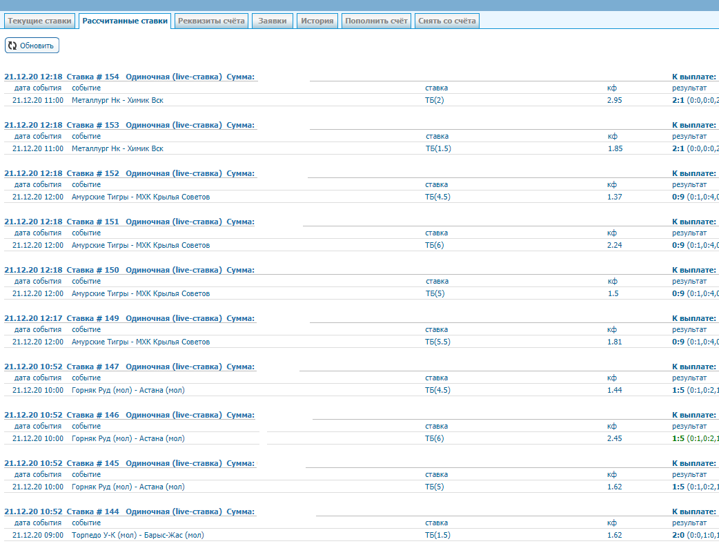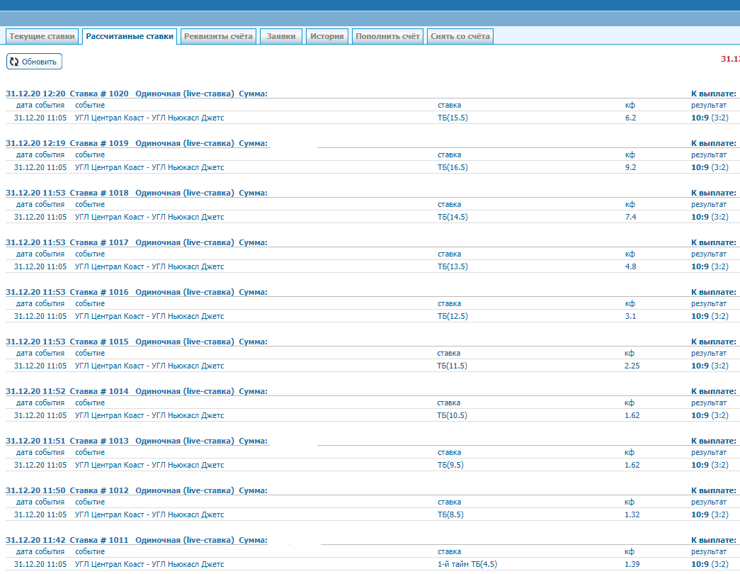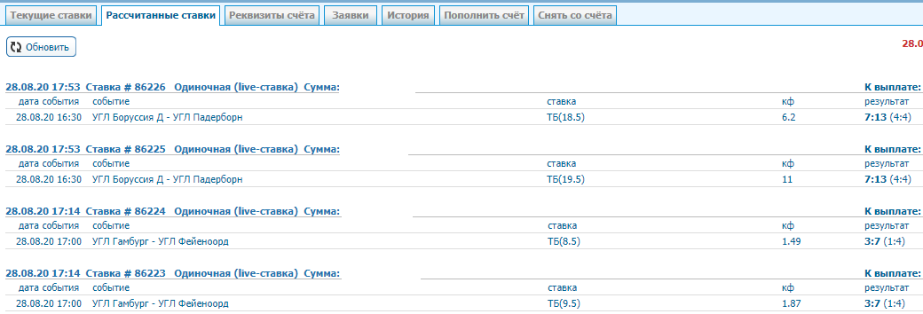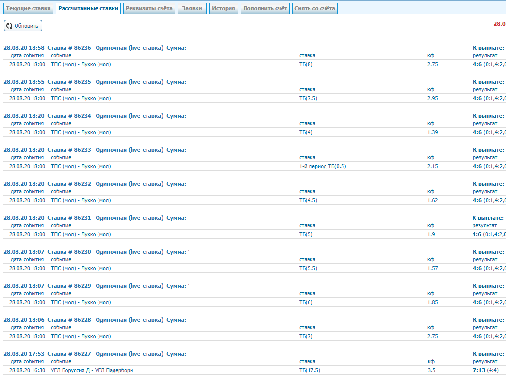 Для особо внимательных - после последних проблем с вводом / выводом средств на карту в рублях - сменил аккаунт на валюту евро - вот отчего история ставок начинается практически с нуля...:)